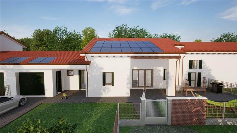 Se stai cercando un'abitazione in zona di campagna, immersa nel verde, abbiamo la casa che fa per te. In periferia di Noale, proponiamo una nuova porzione centrale di trivilla in corso di costruzione con consegna al grezzo avanzato od al finito chiavi in mano, composta al piano terra da ingresso soggiorno, cucina abitabile, disimpegno, 2 camere, 2 bagni finestrati, 2 portici, garage e vano tecnico. Al piano primo da grande soffitta di 50 mq con altezza media di 2,41 mt e bagno. Giardino di proprietà. Riscaldamento a pavimento in pompa di calore, fotovoltaico 8 Kw, predisposizione impianto di allarme, ventilazione meccanica, serramenti in Legno ecc..€ 220.000 al grezzo avanzato, € 350.000 al finito chiavi in mano la porzione a EST, mentre la porzione a ovest € 240.000 al grezzo avanzato, € 380.000 al finito